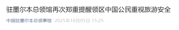 10月5日下午,中国驻墨尔本总领事馆微信公号发布消息,郑重提醒领区中国公民重视旅游安全。