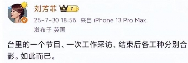 她表示两人只是工作上的关系,合影不过是例行公事,工作人员都分别合影了,最后仅此而已四个字,就是告知大众,他们之间什么都没有。