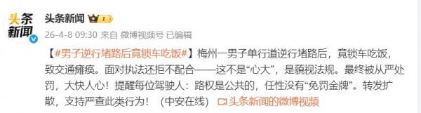 这件事也给所有交通参与者提了醒,公共道路资源需要所有人共同维护,只顾自身方便侵犯他人权益,最终只会受到法律的相应处罚。