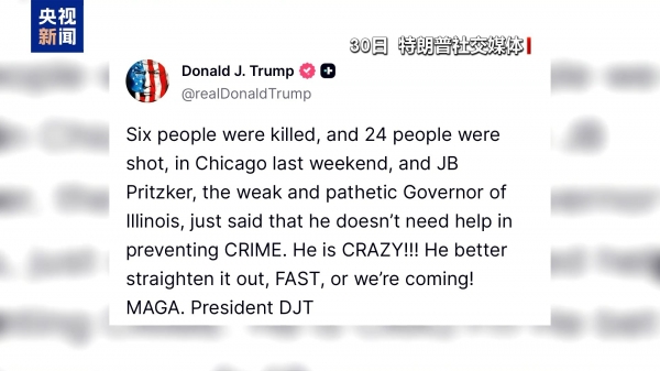 特朗普当天在其"真实社交"平台上发帖抨击伊利诺伊州州长普里茨克"软弱可悲",称"芝加哥上周就有6人被杀、24人遭到枪击",对方却声称"在预防犯罪方面不需要帮助"。特朗普再次发出威胁:"他最好迅速搞定事情,不然我们就要来了!"