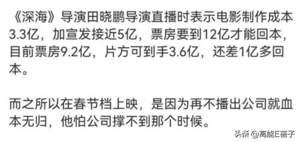 以电影《深海》为例,深海制作成本3.3亿,票房要12亿左右才能回本。