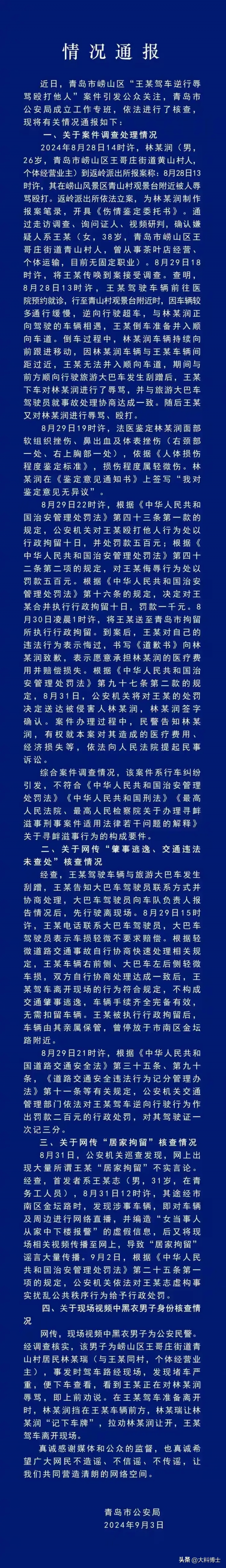 9月3日,青岛市公安局对崂山区"路虎女逆行打人事件"进行了最终通报。