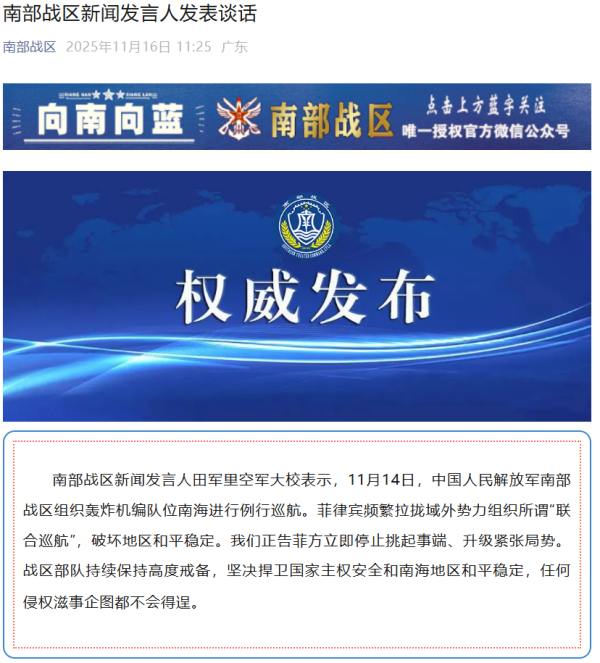 南部战区新闻发言人田军里空军大校表示,11月14日,中国人民解放军南部战区组织轰炸机编队位南海进行例行巡航。菲律宾频繁拉拢域外势力组织所谓"联合巡航",破坏地区和平稳定。我们正告菲方立即停止挑起事端、升级紧张局势。战区部队持续保持高度戒备,坚决捍卫国家主权安全和南海地区和平稳定,任何侵权滋事企图都不会得逞。