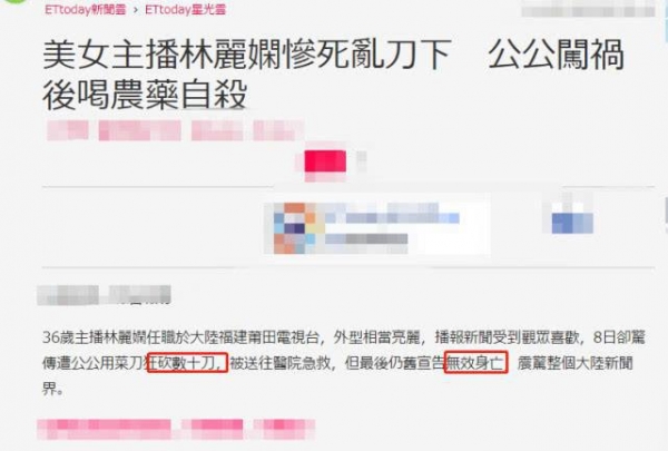 但是,事业正值一帆风顺的林丽娴却遭公公狂砍身亡。其公公用菜刀在她身上狂砍数十刀,最终导致不治身亡。这个消息一经传出,大家都觉得十分震撼和不可思议。