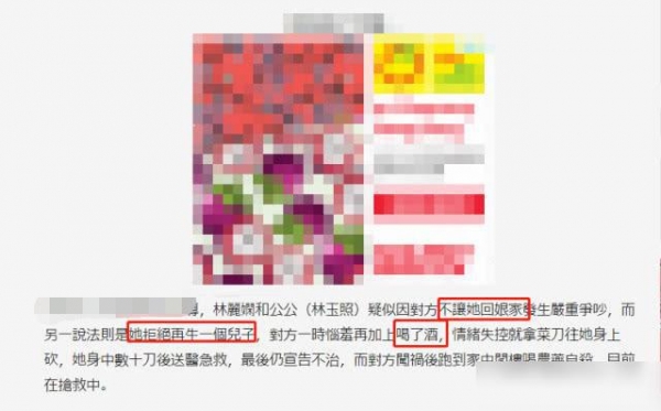 据媒体报道,林丽娴跟公公产生争吵的原因疑似两点,一个是因为其公公不让林丽娴回娘家,第二个是因为其公公一再要求林丽娴再生一个儿子,而林丽娴拒绝了他。再加上其公公晚饭时喝了酒,恼羞成怒后拿起菜刀就砍向了林丽娴。