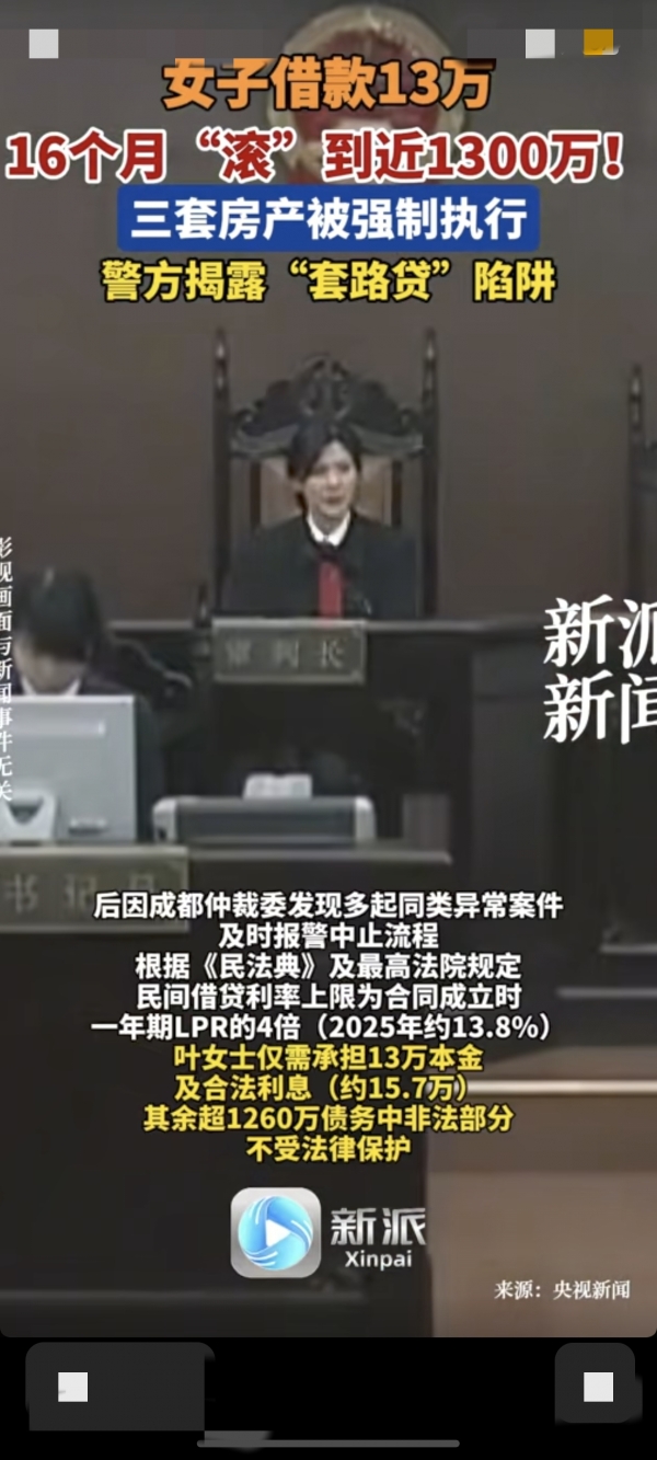 2025年,成都发生了一桩让人大跌眼镜的"套路贷"案件。一女子叶女士本来只想借13万周转,结果短短16个月,债务像滚雪球一样"滚"到了近1300万,最后三套房产都被强制执行,这事儿想想都让人后背发凉!
