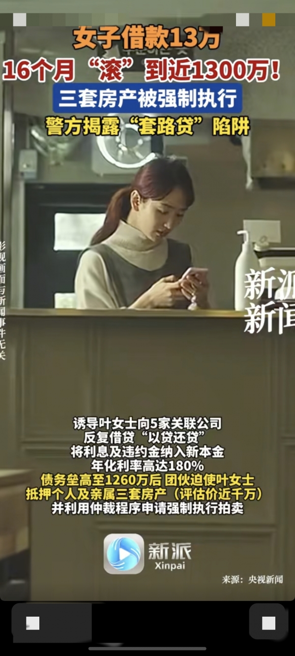 你以为这就完了?更坑的在后面!叶女士借的13万,被他们以"服务费""评估费"的名义扣了2.6万,实际到手就10.4万。这还不算,他们又以"房屋被定为群租房"为由,要叶女士交8.28万违约金,还威胁说提前解约得赔33万。这还不够狠,他们又诱导叶女士向5家关联公司反复借钱"以贷还贷",把利息和违约金都算进新的本金里。就这么折腾了16个月,债务直接飙到了近1300万,然后逼着叶女士把三套房子抵押了出去,评估价才1260万,他们还申请强制执行拍卖。