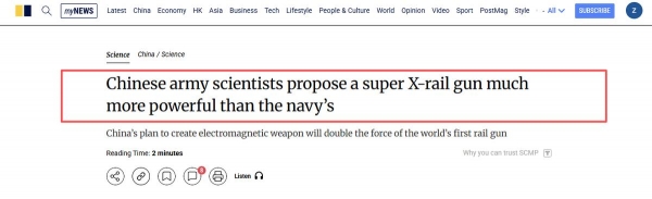 ▲《南华早报》报道X型电磁炮