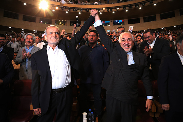 2024年6月19日,在伊朗德黑兰竞选会议上,马苏德·佩泽希齐扬和穆罕默德·贾瓦德·扎里夫(右)高举双手。 澎湃影像