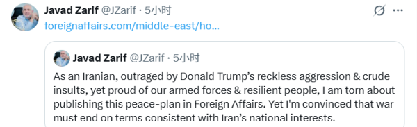 当天,扎里夫还在社交平台X上表示:"身为伊朗人,我对特朗普鲁莽的侵略行径与粗俗侮辱感到愤怒,但同时又为我们的军队和坚韧的人民感到自豪。因此,我对于是否要在《外交事务》上发表这份和平计划感到十分矛盾。但我坚信,战争必须以符合伊朗国家利益的方式结束。"