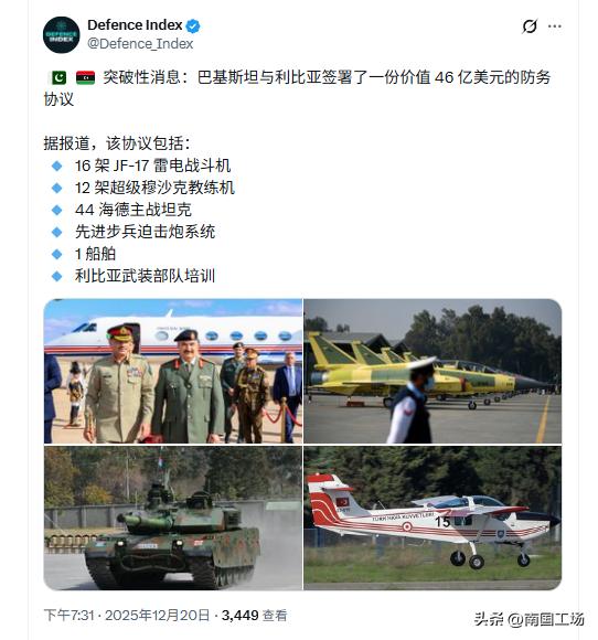 "巴基斯坦武器卖爆了!"巴基斯坦方面和马来西亚防务论坛在2025年12月21日爆料称:"巴基斯坦与利比亚国民军,签署了一份价值46亿美元的防务军购协议。"据巴基斯坦方面报道,该协议包括,利比亚国民军向巴基斯坦采购16架JF-17枭龙战斗机,12架超级穆沙克螺旋桨初级教练机,44辆巴基斯坦版本的VT-4坦克,"海德尔"主战坦克,先进步兵迫击炮系统,1艘船舶,巴基斯坦军方对利比亚国民军武装部队的人员培训等。这是继苏丹政府军向巴基斯坦提出15亿美元的军火订单后,巴基斯坦再度拿下了史诗级订单,订单规模超过了46亿美元!