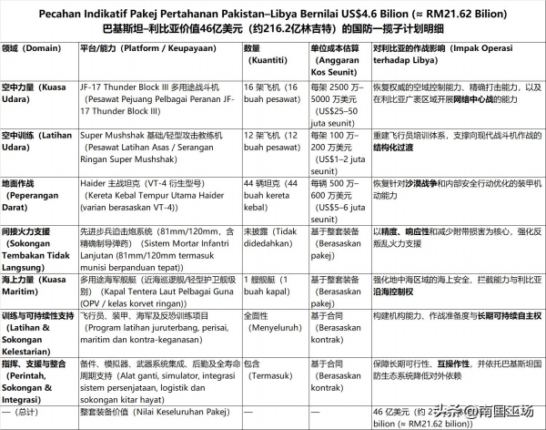 而根据马来西亚媒体分析,利比亚国民军向巴基斯坦采购多用途战斗机,JF-17"枭龙"Block-III战斗机,一共16架,每架枭龙战斗机的价格为2500万至5000万美元,目的是恢复利比亚空军的影响力、空中控制能力、精确打击能力以及跨利比亚广阔地区的网络空中作战能力;巴基斯坦生产的教练机/轻型攻击机,12架"超级穆萨克",每架100-200万美元,重建利比亚国民军的飞行员训练链,并允许向现代战斗机操作进行结构性转变;陆地作战,巴基斯坦生产的海德尔主战坦克(巴基斯坦生产的VT-4坦克) 44辆坦克,每辆500万至600万美元,专为利比亚国民军沙漠作战,强化装甲机动能力。