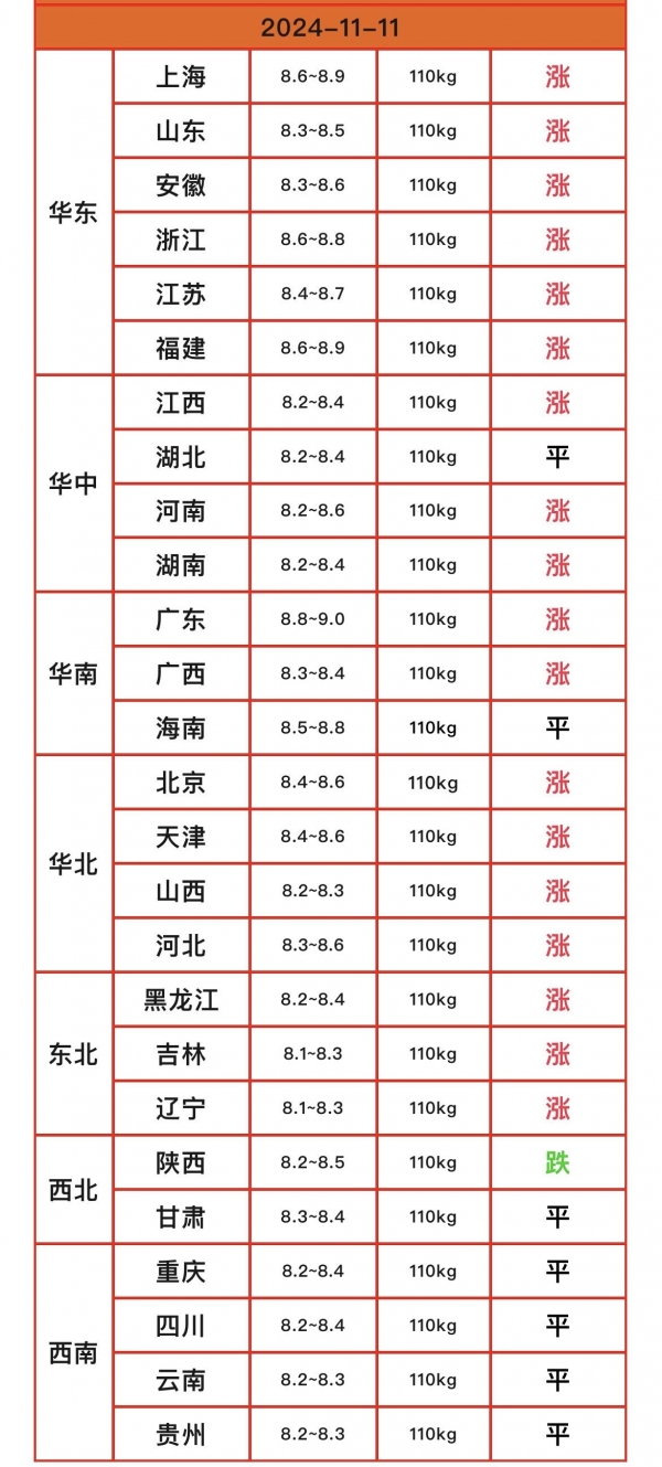 截至11月11日为止,全国的生猪外三元均价为16.79元/公斤,较昨日的猪价上涨了0.04元,猪价行情呈现出"一片火红"的景象。具体的猪价表现为,华东,华北,东北的猪价集体性上涨,上涨幅度在0.05~0.10元之间;华中,华南地区的猪价稳中上涨,多数地区都是上涨,只有湖北,海南的猪价没有上涨,西南地区的猪价保持稳定;西北地区的猪价稳中下跌,陕西的猪价下跌了0.10元。