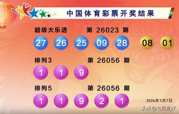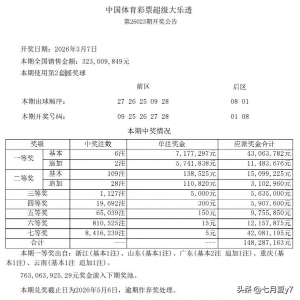 3月7日,中国体育彩票超级大乐透第26023期正式开奖,本期采用第2套摇奖球,全国销售金额达323,009,849元,开奖结果已正式公布。