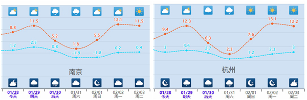 本次过程雨雪到来的同时还将伴随显著降温,未来三天,南方不少地方的冰冻感将会非常明显,尤其对于部分将经历雨雪过程的地区,可能会出现白天午后气温还低于前一天夜间的气温倒降情况。大城市中,郑州、合肥、武汉、南京、杭州、长沙最高气温都将从10℃左右下降到5℃或以下,其中南京、杭州29日至31日最高和最低气温都将跌至冰点上下,"冻感"十足!