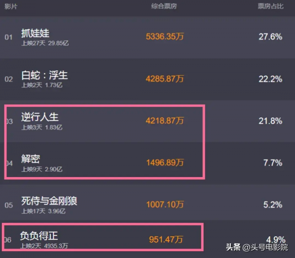 周末,徐峥执导兼主演的电影《逆行人生》正式上映,朱一龙主演的爱情片《负负得正》也加入,陈思诚上映了一周多的电影《解密》在口碑垮了之后,还在艰难求票房。