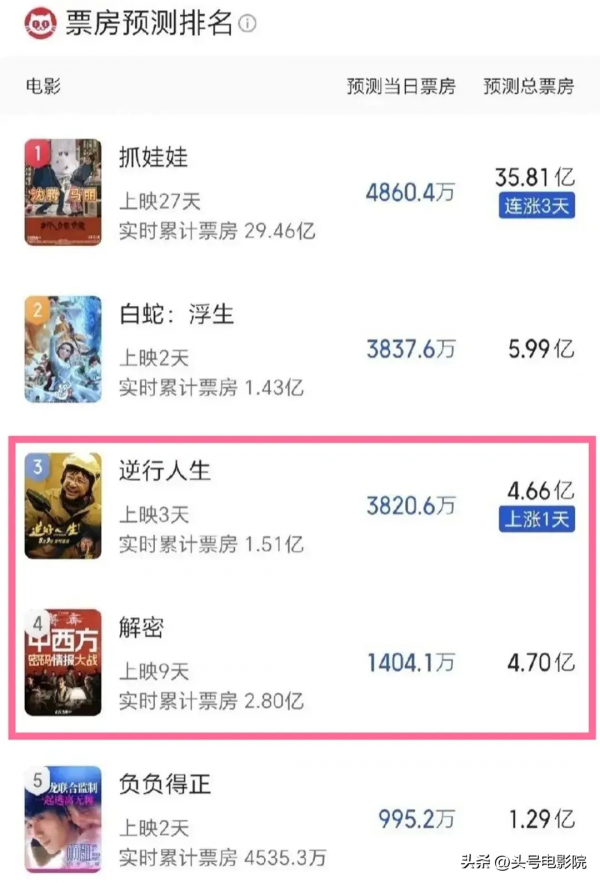 目前猫眼预测《逆行人生》和《解密》的票房不足5亿,还不及《白蛇:浮生》的近6亿,《负负得正》才1亿多,还是沈腾和马丽主演的《抓娃娃》依然遥遥领先,破30亿在即,预测有35亿。