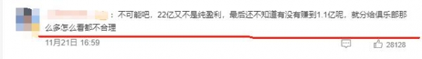 "不可能吧,22亿又不是纯盈利,不知道王宝强自己有没有赚到1.1亿,怎么可能给俱乐部分这么多?"