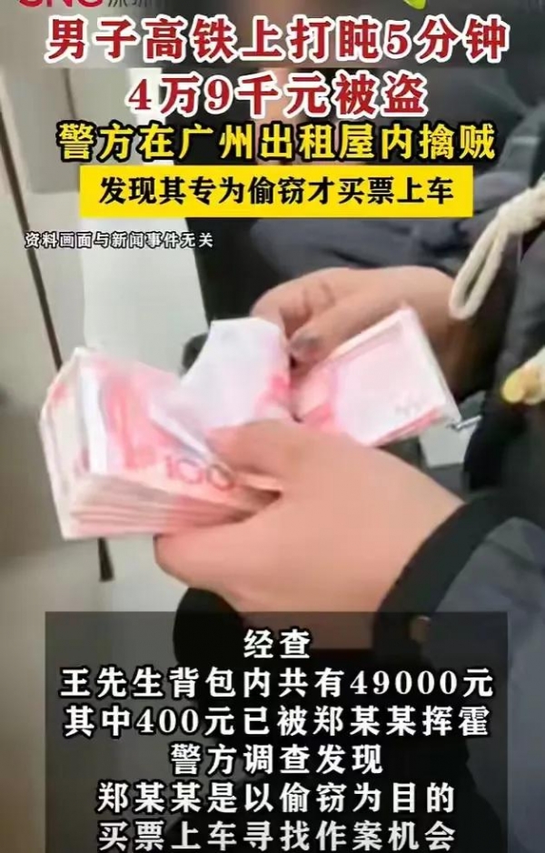 事发深圳开往广州白云的C7038次城际列车,旅客王先生因商务周转,随身携带49000元现金,装在双肩包放上头顶行李架。只是闭眼小憩约5分钟,再睁眼时,包内现金已被洗劫一空。