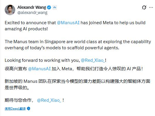 随后,Meta首席人工智能官Alexandr Wang发推文称,欢迎Manus AI的加入。