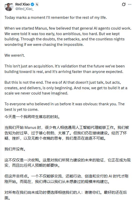 CEO Red 肖弘也发声称,"这不仅仅是一次收购。它验证了我们一直以来努力构建的未来是真实存在的,而且它的到来比任何人预期的都要快。"