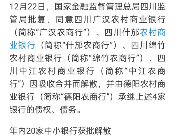 来自国家金融监管总局的消息,截止去年末,有20家农村中小银行获批解散。