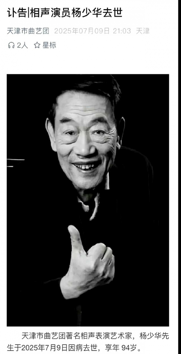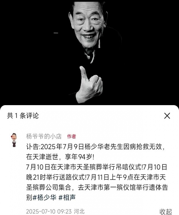 天津相声泰斗杨少华7月9日去世,葬礼安排已公开,但家属与曲艺同仁对离世细节说法不一引关注。