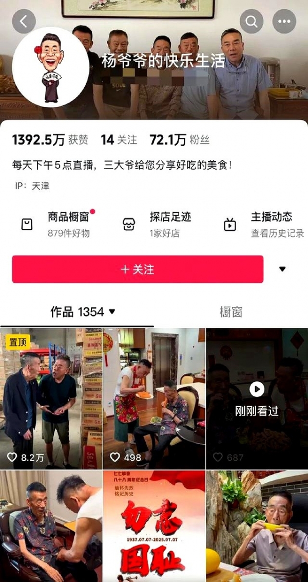 翻看家属运营的"杨爷爷的快乐生活"账号,过去两年几乎日更三四个视频,全是杨老坐着轮椅带货。