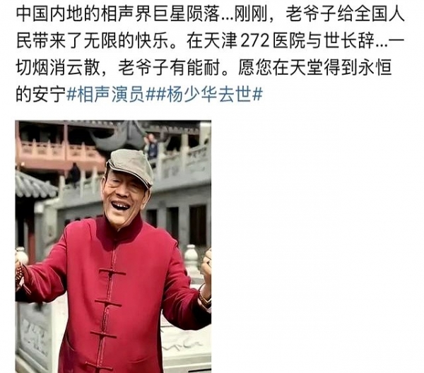 杨少华儿子明确说明,老爷子当天午睡后突感头晕,紧急送医途中去世。