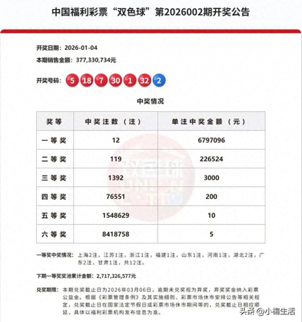 2026年1月4日晚,中国福利彩票双色球游戏迎来第2026002期开奖。本期开奖号码为红球01、05、07、18、30、32,蓝球02。全国共开出12注一等奖,单注奖金高达679万余元。