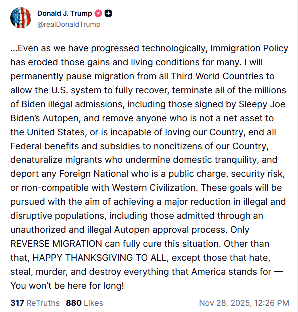 11月28日,特朗普在社交媒体"X"和"真实社交"上发帖,突然宣布将"终止向菲美国公民提供所有联邦福利和补贴",并"永久暂停来自所有'第三世界'国家的移民"、"让美国体系完全恢复"。