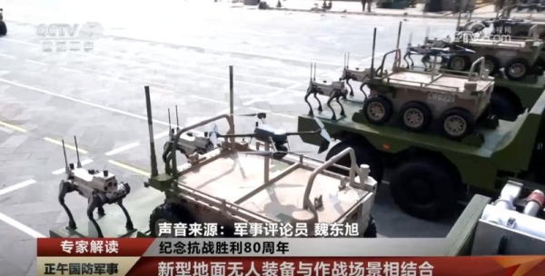 军事评论员 魏东旭:这次阅兵中很多装备确实都是新面孔,比如说在地面作战场景当中,有无人侦察和突击的车辆。别看它个头很小,但是威力很大,能够针对对方的动态目标和静态目标进行精准的火力压制。还看到了智能化的工兵,也就是履带式无人底盘,可以破障,也可以清除雷场,可以让有人的、无人的作战装备快速进行突破。