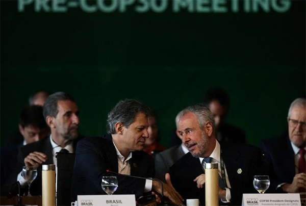 巴西财政部长费尔南多·哈达德(左)与COP30主席安德烈·科雷亚·多拉戈在COP30筹备会上交谈。 路透社