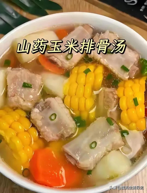 - 加山药、玉米、胡萝卜再炖30分钟,加盐调味,山药糯、排骨香,汤喝着超润。
