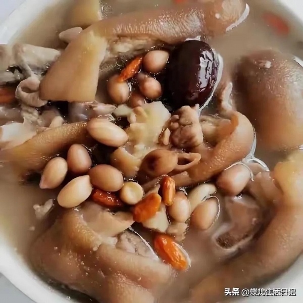材料:猪蹄1只、红枣6颗(去核)、花生30g、枸杞15粒、姜片3片