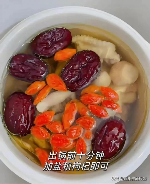 - 最后放枸杞再炖10分钟,加盐调味,汤清味鲜,连肉带汤都吃光。