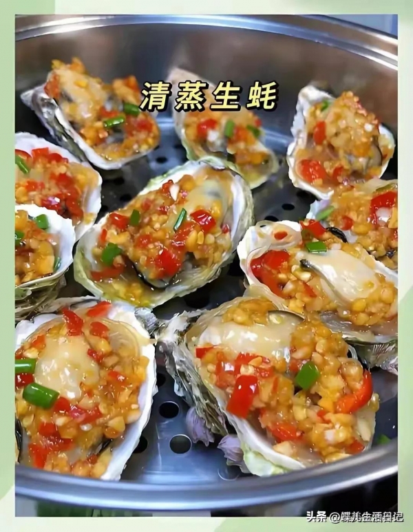 - 生蚝摆进蒸盘,淋上蒜蓉酱,水开后蒸5分钟,出锅撒葱花,鲜到舔壳。