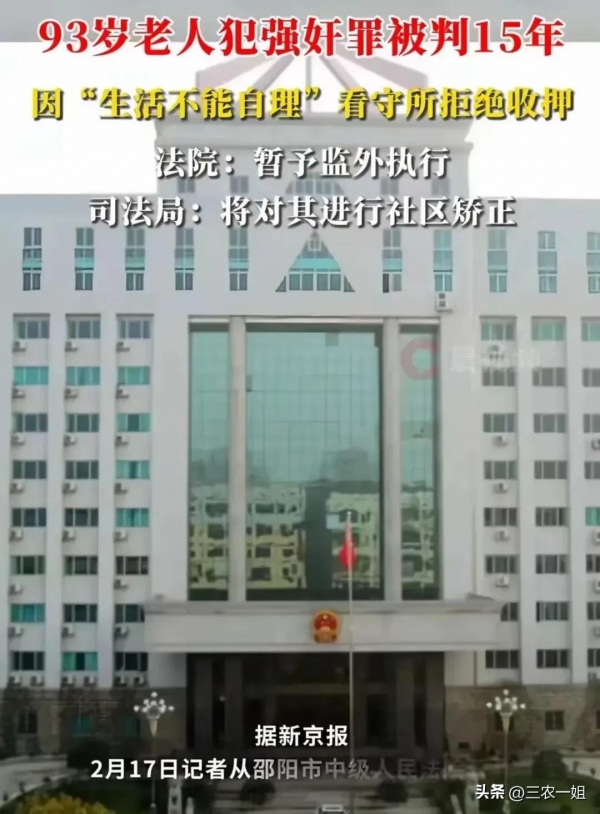 湖南一位93岁的老人犯了强奸罪,被判处15年的有期徒刑,结果却是"无牢可坐",也就是看守所或者监狱拒绝收件这位93岁的老强奸犯。原因非常的简单,那就是太老了,生活不能自理!