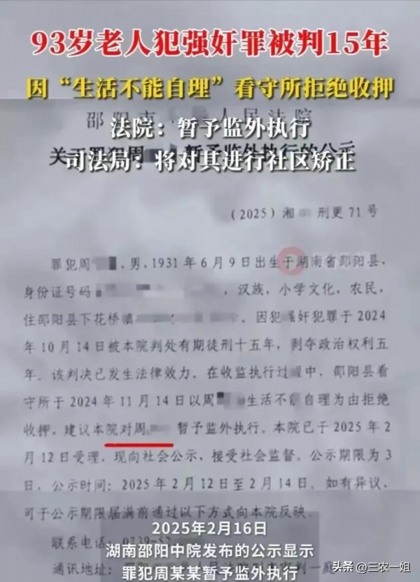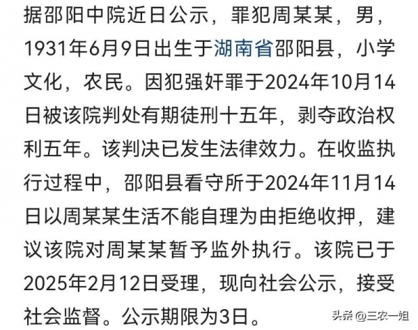 2月16号,湖南邵阳法院公布了一起关于强奸犯周某某暂予监外执行的公示: