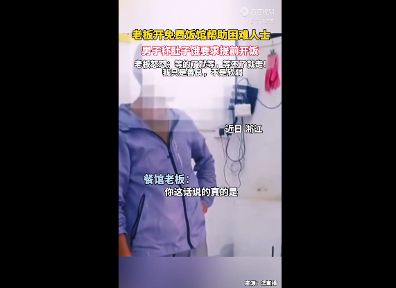然而,男子似乎觉得自己理所当然,语气中带着点急切:"我也不是要占便宜,只是实在太饿了,麻烦你帮帮忙。"老板一边为难,一边试图婉转拒绝:"不好意思啊,今天还没有准备好,不能提前开饭。请您理解一下。"谁知,男子的反应却出乎意料:"你们这点时间都不愿意帮我,真是太不讲理了。就开个饭,难道也那么难吗?"