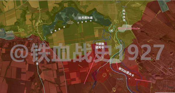 在东部的康斯坦丁诺夫卡方向,比乔克水库南部的乌军已接近于被包围,军事纪实报称,包围圈面积为4公里乘以7公里,可能有几千名乌兵被围在了圈中,包括乌军精锐亚速旅。过去两天,俄军强渡托列茨河,攻到了水库东端,几乎封死了乌军的逃跑路线,这迫使水库南部的乌军和谢尔比诺夫卡的乌军进行了一波大撤退,俄军趁势攻入卡捷琳诺夫卡,大部分乌军躲到了比乔克水库的沿湖森林中,而俄军正用大炮猛烈轰炸,这些乌军除非用船运过水库,否则大部分人都跑不了了。
