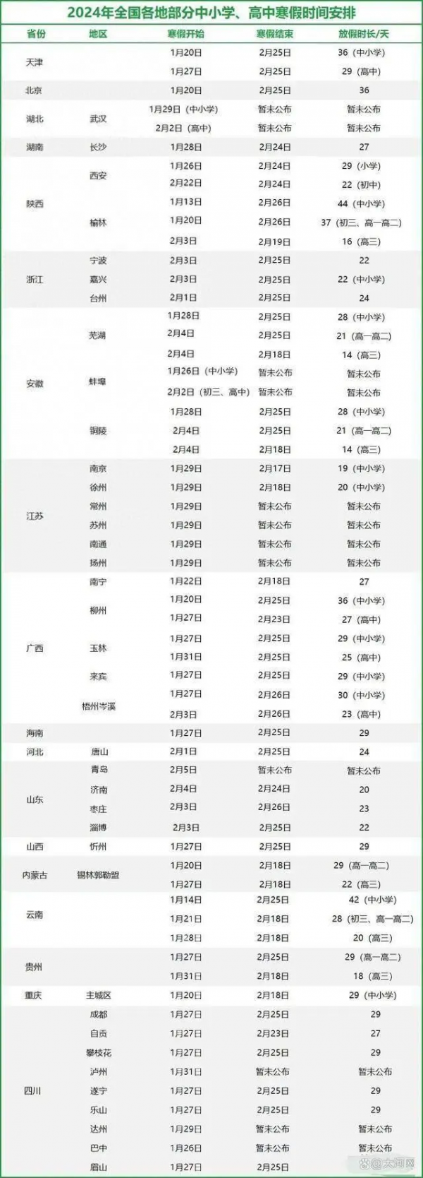 全国各地中小学寒假时间安排如下: