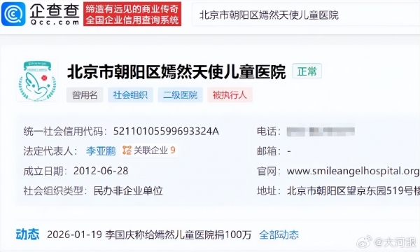 据企查查平台显示,嫣然天使儿童医院法定代表人李亚鹏,注册资金1000万元,是一家民办非企业单位。往年工作报告显示,该院理事会由李亚鹏等5名理事、1名监事组成,理事不享有医院的经济回报,且终身不分红。
