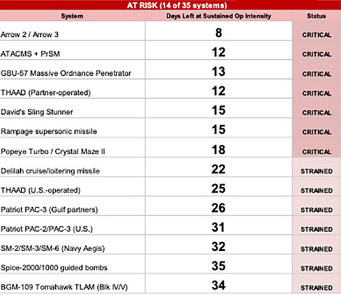 佩恩研究所估算了多种弹药的头4天消耗量,得出按这一用量库存的耗尽天数,深红为紧急,浅红为承压 佩恩研究所