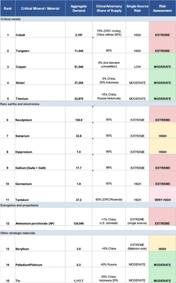 佩恩研究所估计的重要材料风险程度,考虑是否为中国或其他战略对手"主导",以及单一来源的风险。材料依次是:钴、钨、铜、镍、钛,钕、钐、镝、镓(砷化镓+氮化镓)、锗、钽,高氯酸铵(AP),铍、钯/铂、锡 佩恩研究所