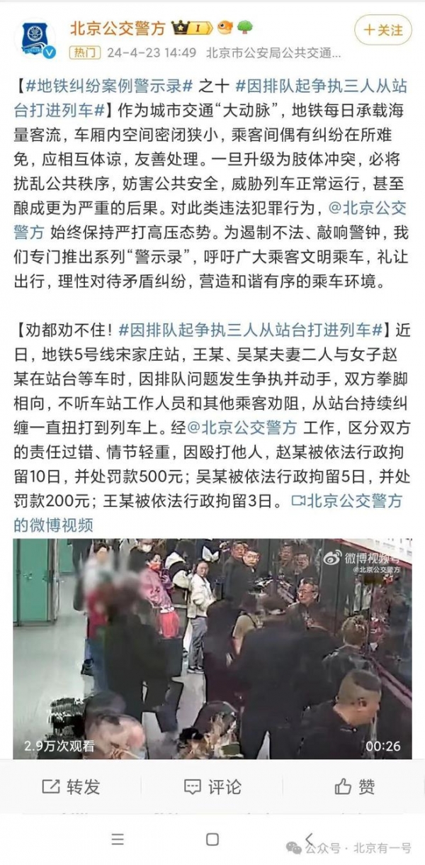 据"北京公交警方"通报:近日,地铁5号线宋家庄站,王某、吴某夫妻二人抱着孩子与女子赵某在站台等车时,因排队问题发生争执并动手,双方拳脚相向,不听车站工作人员和其他乘客劝阻,从站台持续纠缠一直扭打到列车上。