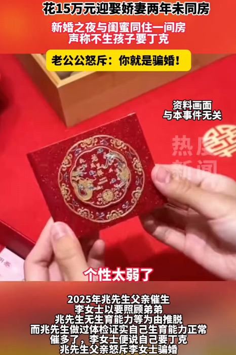 湖南长沙一则婚姻纠纷引发热议:兆先生花 15 万彩礼娶回二婚妻子李女士,没等来期待中的孩子,反而被对方告知 "坚决丁克",更让人崩溃的是,两人婚后长期分居,甚至新婚夜新娘都没同房。愤怒的男方一家直接将妻子告上法庭,要求其离开家庭并讨要说法,网友纷纷直呼 "这分明是骗婚"!