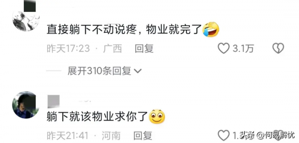 也有网友表示,孩子做的不对,应该直接躺下不动,物业反过来赔偿,而不是索赔。