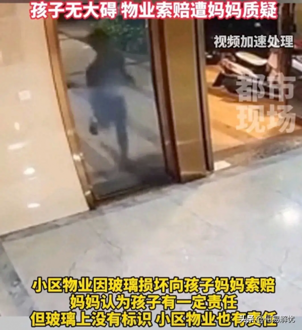 物业保安巡视时发现,让孩子的妈妈赔玻璃钱。孩子的妈妈很无语:"这种玻璃没有标识,幸好孩子没大碍;发生这样的事情,难道物业没有责任吗?"
