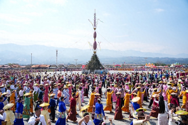 人们围着"赏建"树踏鼓而舞